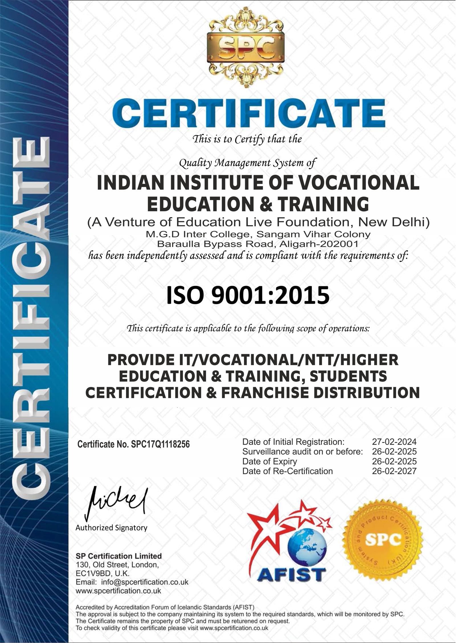 IIVET Institute Sponsored By “Education Live Foundation” Delhi (A Charitable Education Trust) An ISO 9001: 2008 Certified Accredited from Government of NCT Delhi (Regd. No. 4063) Under An Act 1882 Section 60 Govt. of India working in different fields of Education Information technology, Vocational Education, Nursery Teachers Training etc.